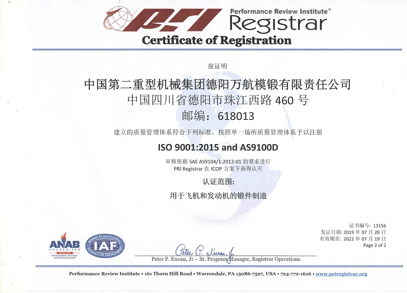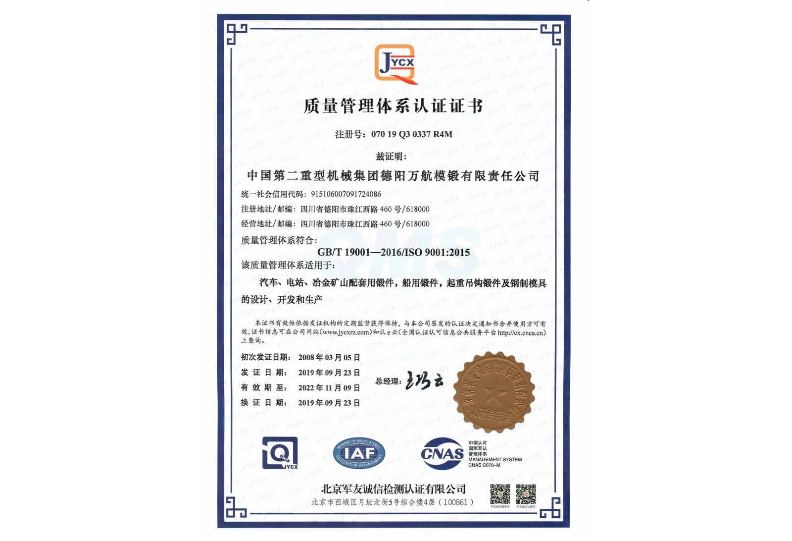 中國第二重型機械集團德陽萬航模鍛有限責任公司(以下簡稱“萬航模鍛”)是世界500強之一的中國機械工業(yè)集團有限公司旗下中國第二重型機械集團有限公司與中國航空工業(yè)集團公司共同持股的有限責任公司。 萬航模鍛集科研、設(shè)計、生產(chǎn)、經(jīng)營于一體,以研制生產(chǎn)航空鍛件為主導產(chǎn)品,產(chǎn)品覆蓋航空、航天、能源、艦船動力、鐵路、汽車、起重等行業(yè)。在產(chǎn)品鍛造設(shè)計、技術(shù)工藝、熱處理、理化檢驗及模具加工制造等方面,具有國內(nèi)領(lǐng)先的優(yōu)勢。產(chǎn)品研制主要包括:鈦合金、超強鋼和結(jié)構(gòu)鋼、高溫合金、鋁合金。公司可制造各類大型模鍛件、大型模具以及模鍛件粗加工和成臺套機械產(chǎn)品,可完成各種類型的熱處理和表面處理工藝??芍圃斓拇笮湍>邌沃貫?00T,大型軸類模鍛件長度可達6.5m,圓形模鍛件直徑可達2.5m。 面向新時代,萬航模鍛將不忘初心,繼續(xù)前進,不斷推進高端產(chǎn)品和前沿技術(shù)的產(chǎn)業(yè)化,著力打造世界一流航空模鍛件供應(yīng)商。企業(yè)資質(zhì)