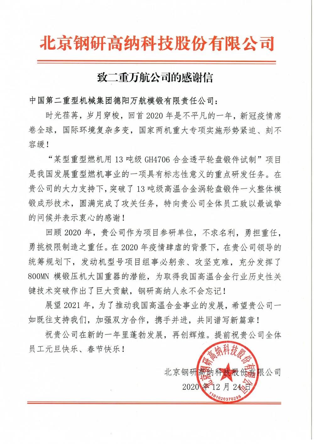 (通訊員 劉洋)日前,某型重型燃機(jī)用13噸級(jí)GH4706合金透平輪盤(pán)鍛件在萬(wàn)航模鍛首制成功。北京鋼研高納科技股份有限公司特發(fā)來(lái)感謝信。
