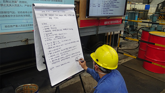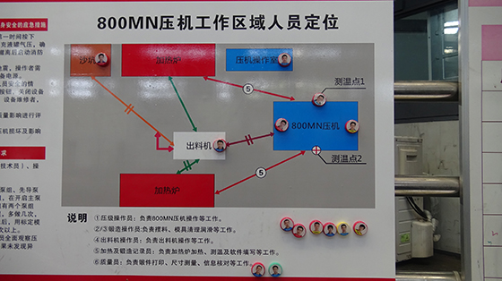 萬航公司模鍛廠800MN生產(chǎn)班組在該13件產(chǎn)品的制造過程中,以《鍛造工藝卡》為操作綱領(lǐng),嚴(yán)格貫徹落實各項工藝要求。在鍛造前,班組成員對制造過程進(jìn)行了全面梳理,分解落實了各工序的操作要求,并對人員工作區(qū)域進(jìn)行了定位。制造過程中,班組各工序人員嚴(yán)格按照分工職責(zé)在定位區(qū)域內(nèi)按生產(chǎn)前議定的操作要領(lǐng)規(guī)范操作,整個鍛造過程有條不紊、井然有序,且每一件產(chǎn)品的生產(chǎn)過程均保持一致。